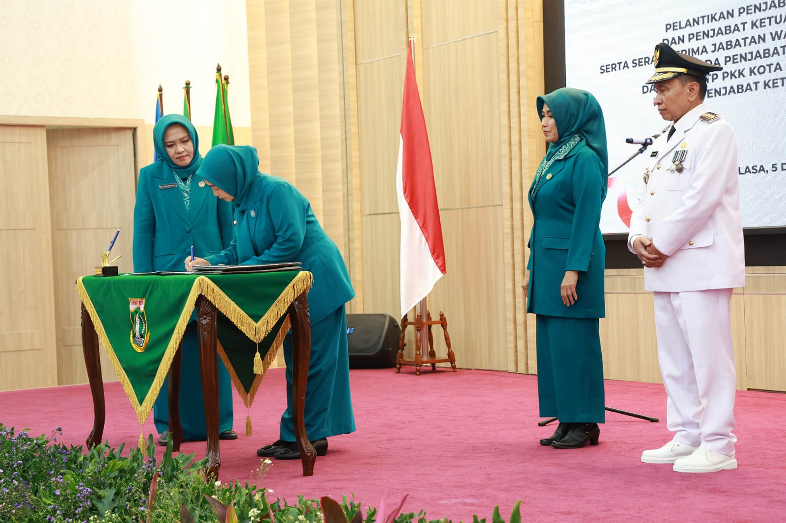 SERANG, DISTRIKBANTENNEWS.COM – Penjabat (Pj) Ketua Tim Penggerak Pemberdayaan Kesejahteraan Keluarga (TP PKK) Provinsi Banten Tine Al Muktabar melantik Pj TP PKK Kota Serang Nurhasanah Yedi Rahmat di Pendopo Gubernur KP3B Curug Kota Serang, Selasa (5/12/2023).
