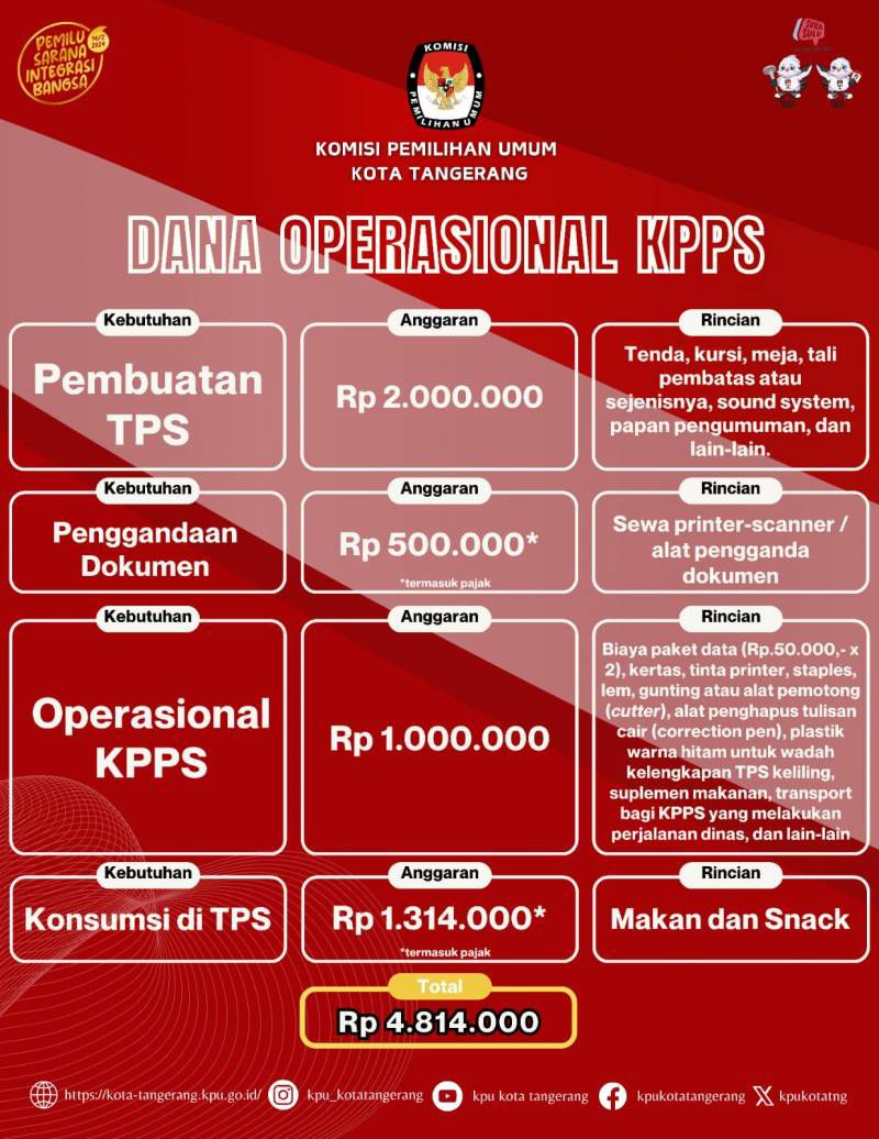 Biaya operasional ini berdasarkan surat Sekretaris Jenderal KPU Nomor 644/PP.08.1-SD/06/2024 perihal Penataan Logistik dan Kebutuhan Anggaran di TPS dalam Pemilu 2024. Setiap KPPS menerima biaya operasional sejumlah Rp4.814.000.