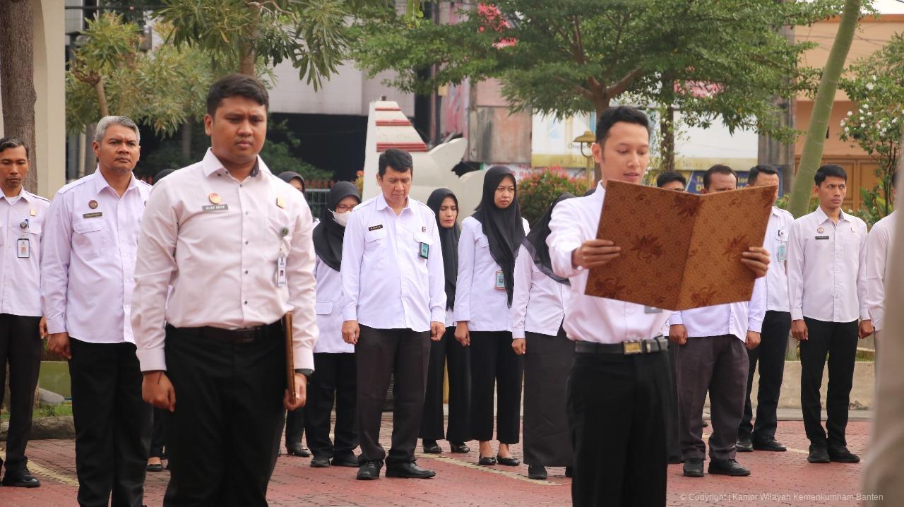 Serang – Kantor Wilayah Kementerian Hukum Banten menggelar upacara bendera untuk memperingati Hari Kesaktian Pancasila dengan khidmat di Lapangan Upacara Kanwil pada Rabu, 1 Oktober 2025.