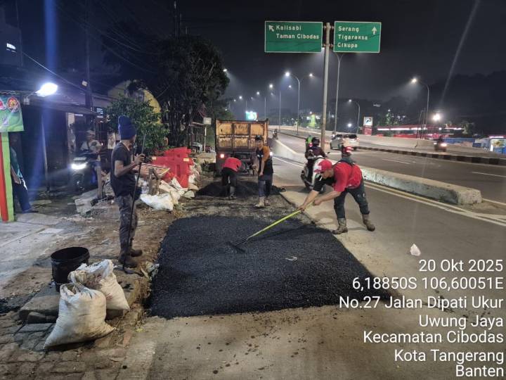KOTA TANGERANG – Perusahaan Umum Daerah (Perumda) Tirta Benteng Kota Tangerang melakukan perbaikan jalan di sejumlah titik yang terdampak pekerjaan galian pipa jaringan distribusi air, di Jalan Gatot Subroto, Kota Tangerang, Senin (20/10) malam.