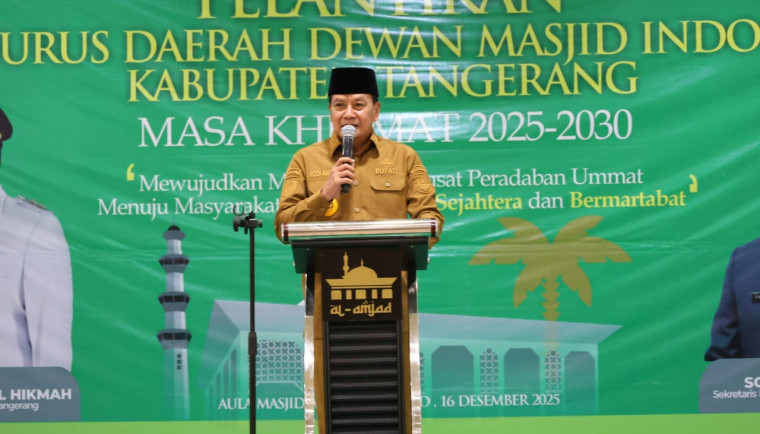 Tangerang — Bupati Tangerang Moch. Maesyal Rasyid menghadiri Pelantikan Pimpinan Daerah Dewan Masjid Indonesia (PD DMI) Kabupaten Tangerang Masa Bakti 2025–2030 yang digelar di Aula Masjid Al-Amjad, Selasa (16/12/25).