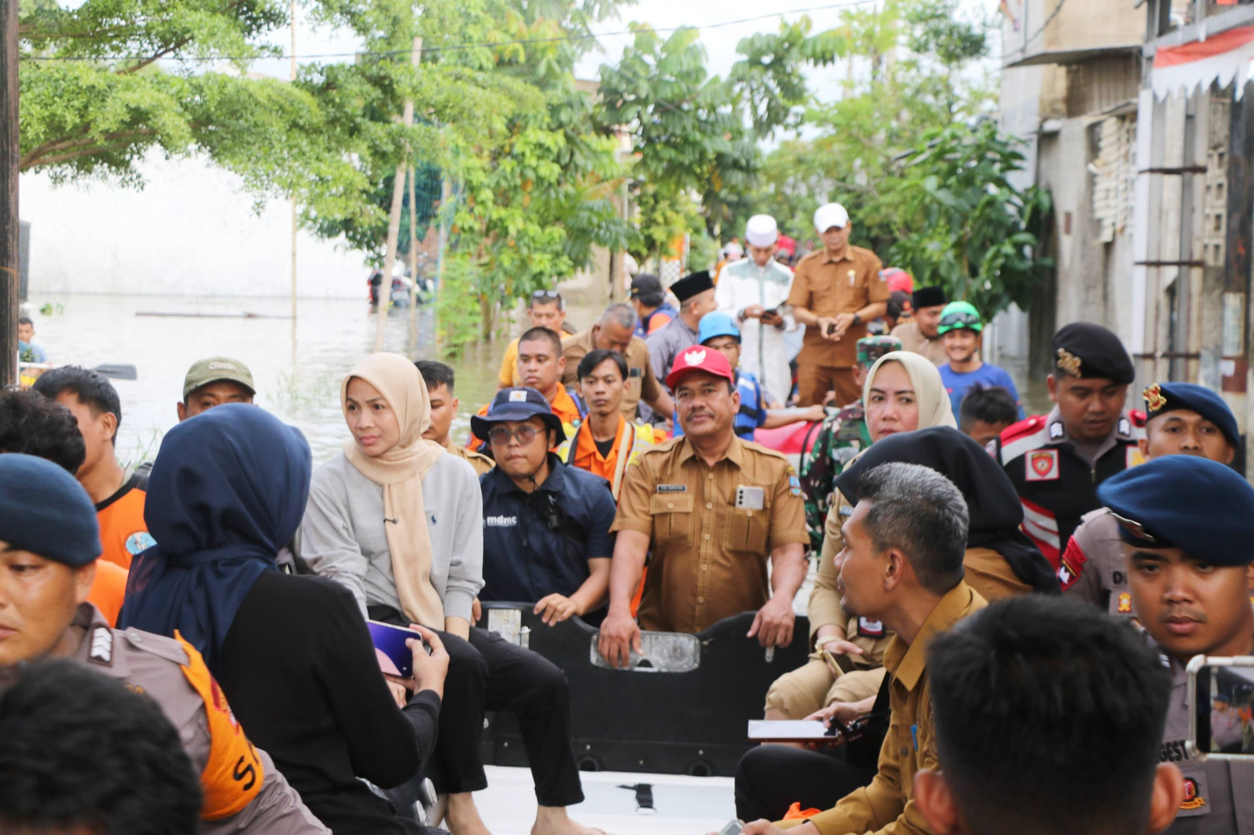 Bupati Serang, Ratu Rachmatuzakiyah, meninjau lokasi banjir di Perumahan Bumi Ciruas Permai (BCP) 2, Desa Ranjeng, Kecamatan Ciruas, Selasa (13/1/2026) sore. Dengan tanpa risih, Ratu Zakiyah menerjang banjir dengan ketinggian air mencapai sepaha orang dewasa untuk menyapa warga dan memberikan bantuan makanan siap saji.