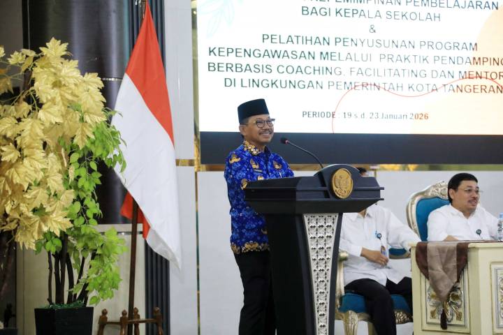 Wali Kota Tangerang, H. Sachrudin, menegaskan bahwa semangat belajar harus senantiasa tumbuh, termasuk bagi mereka yang telah mengabdikan diri di dunia pendidikan. Penegasan tersebut disampaikan Sachrudin saat membuka dua pelatihan strategis bidang kependidikan, yakni Pelatihan Kepemimpinan Pembelajaran bagi Kepala Sekolah serta Pelatihan Penyusunan Program Kepengawasan berbasis Coaching, Fasilitasi Pembelajaran, dan Mentoring, yang diselenggarakan di Balai Besar Pengembangan Penjaminan Mutu Pendidikan Vokasi (BBPPMPV) Bisnis dan Pariwisata, Kementerian Pendidikan Dasar dan Menengah RI, Depok, Senin (19/06/2026).