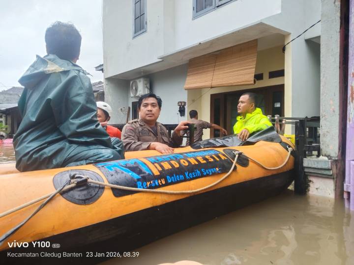 TANGERANG — Petugas gabungan dari Tramtib Kecamatan Ciledug dan Polsek Ciledug bergerak cepat melakukan aksi penyelamatan di tengah kepungan banjir yang merendam Perumahan Puri Kartika Baru, Kelurahan Tajur, Kota Tangerang, Jumat (23/01/26). Luapan Kali Angke sejak Jumat dini hari membuat ratusan rumah terendam dengan ketinggian air mencapai 140 sentimeter.